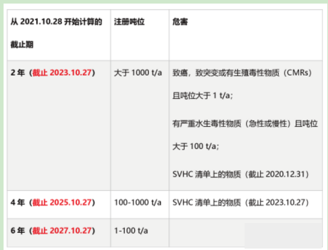 然后根據(jù)化學(xué)品危害和噸位的不同,在2021年10月28日之后的2,4或6年內(nèi)補(bǔ)充完整注冊(cè)信息。
