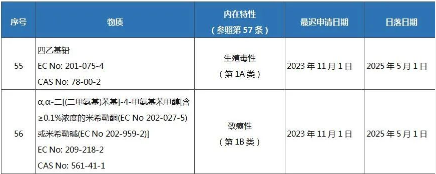 REACH法規附錄XIV(授權物質清單)新增物質如下: